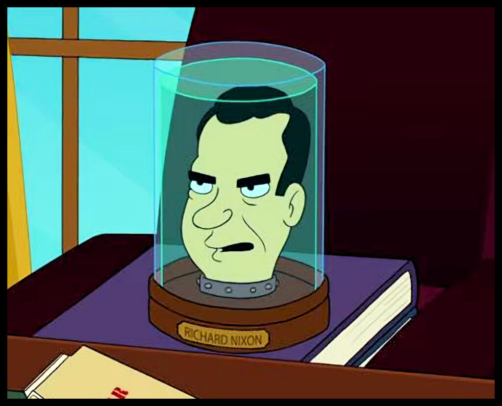 That Futurama episode features a recurring character who is Richard Nixon’s head, preserved and alive in a jar using some weird technology. Nixon’s head is portrayed as a power-hungry politician who cares little about common people but pretends he does.