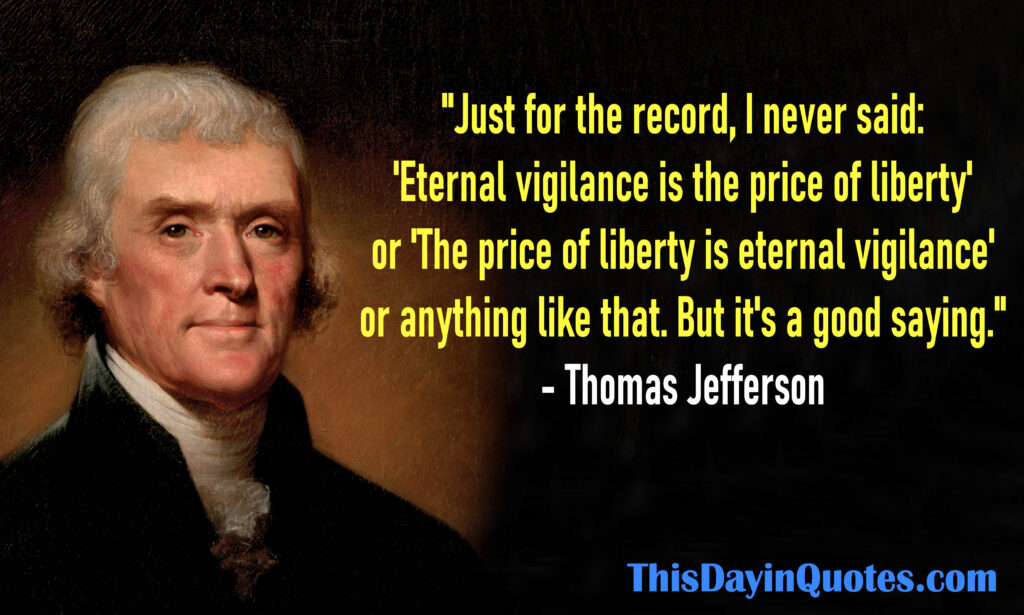 As noted by Jefferson scholars there is no evidence that he ever said or wrote “Eternal vigilance is the price of liberty” or any of its variants.