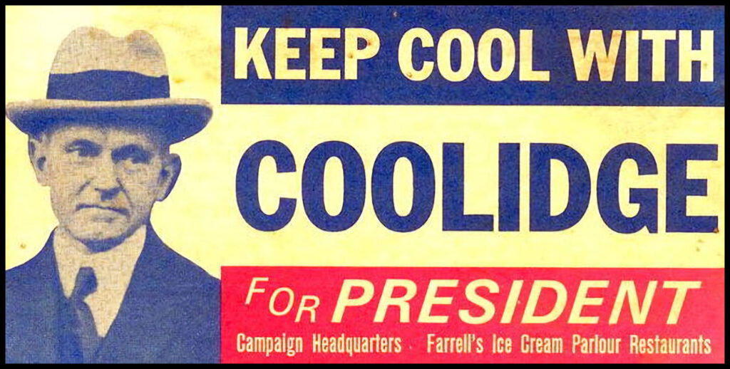 The following year, with his popularity buoyed by a strong economy of the “Roaring Twenties”, Coolidge handily won the 1924 presidential election, using the campaign slogan “Keep Cool With Coolidge.”