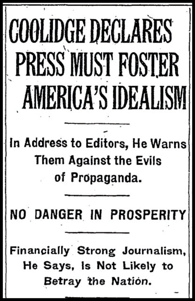 Many newspaper stories about the speech published the following day focused on his comments about idealism. In fact, the New York Times used that aspect of his speech—not his words about “the business of America”—in the headlines and lead paragraphs of its story. You can read NYT article, which includes the full text of Coolidge’s address by clicking this link.