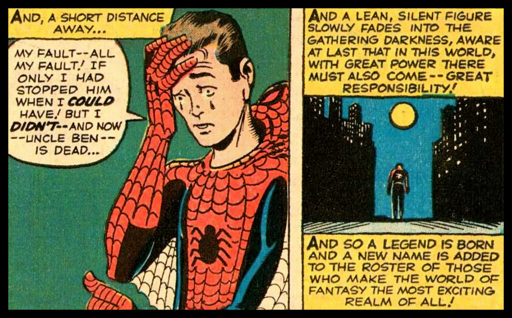In that story, after student Peter Parker accidentally gets his Spider-Man superpowers from the bite of a radioactive spider, he initially uses them to make money by performing in local wrestling matches and other public shows. One night, as he’s leaving a show, he sees a cop chasing a burglar. The cop wants him to help stop the criminal, but Peter refuses. Shortly thereafter, his beloved Uncle Ben Parker is murdered and Peter finds out the killer was the burglar he had refused to capture.